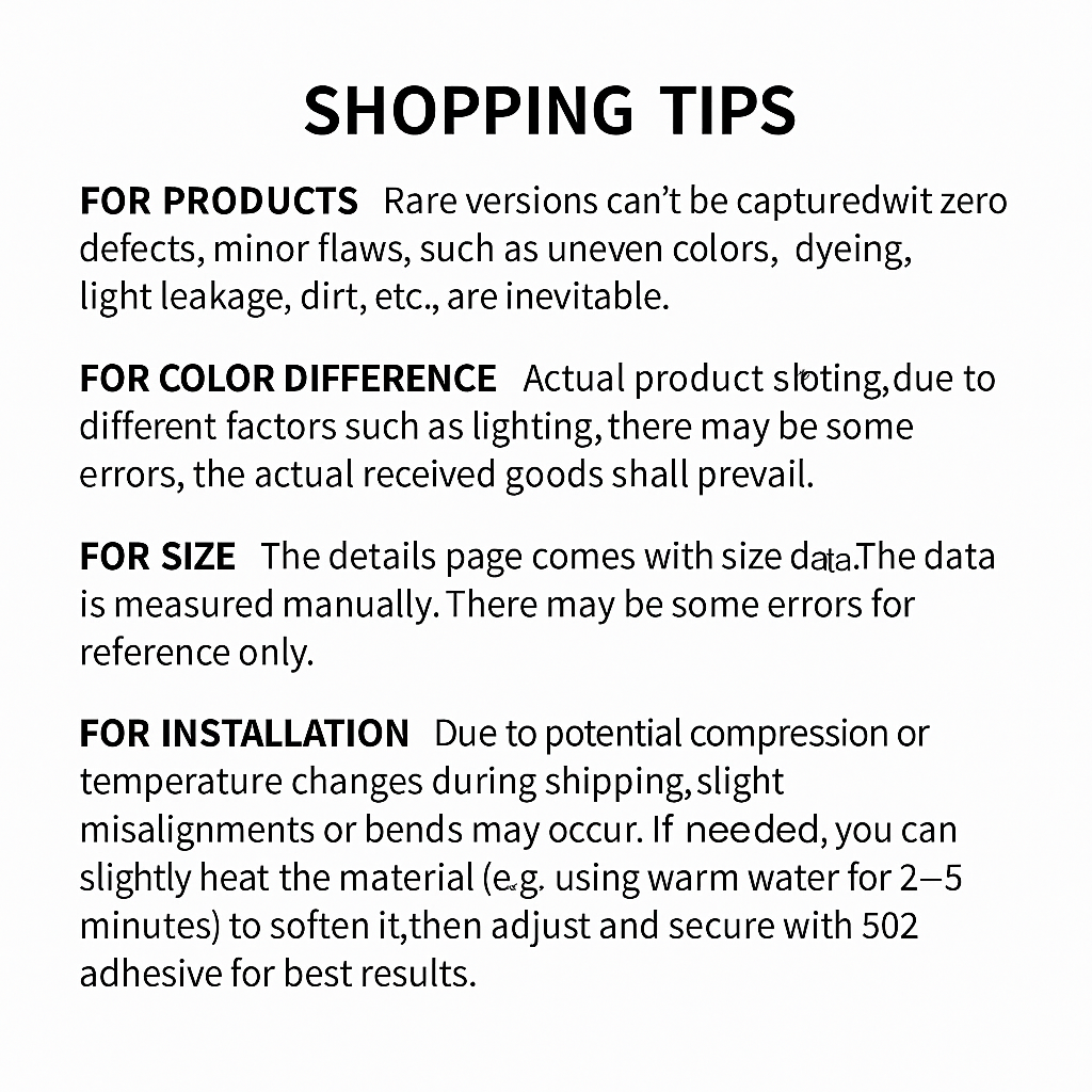 • If any slight bending occurs due to shipping, simply warm the part gently and reshape with care.