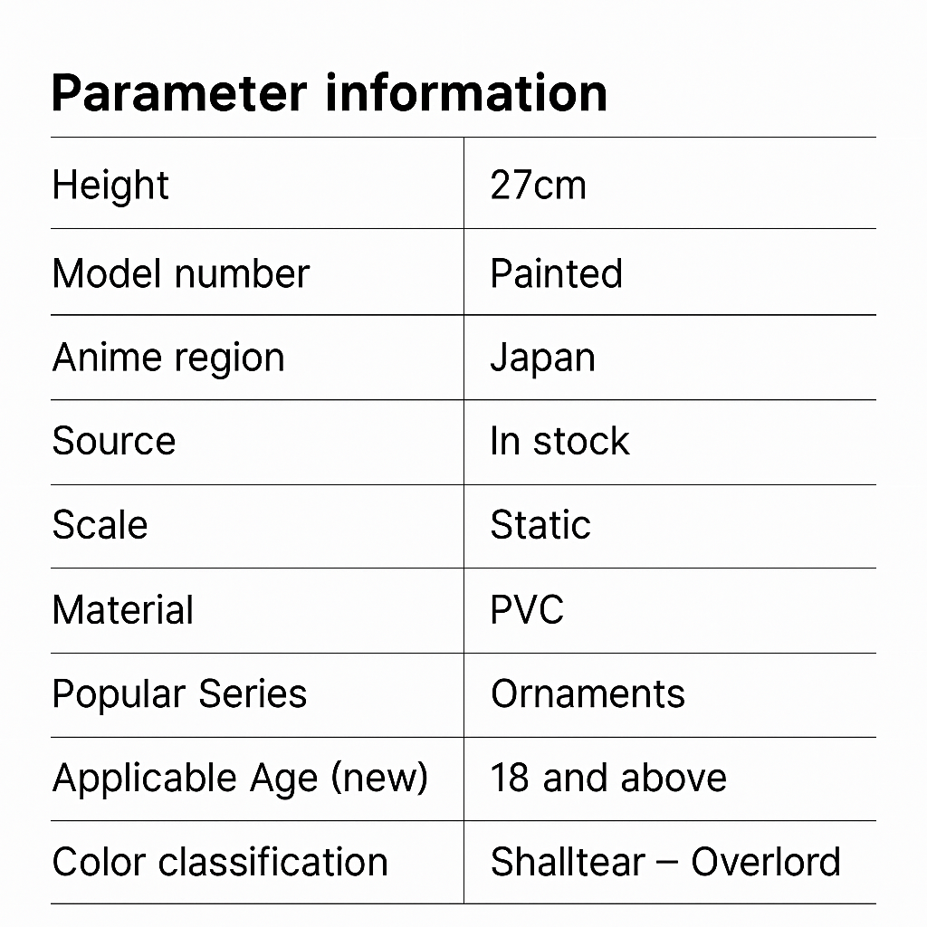 Meticulously painted in monochromatic romance, Shalltear wears a soft ruffled dress, contrasted by the sharp eloquence of her corset belt and laced heels. Every curve of her flowing midnight hair—every stroke of her longing expression—is crafted to whisper: “You remember me, don’t you?”