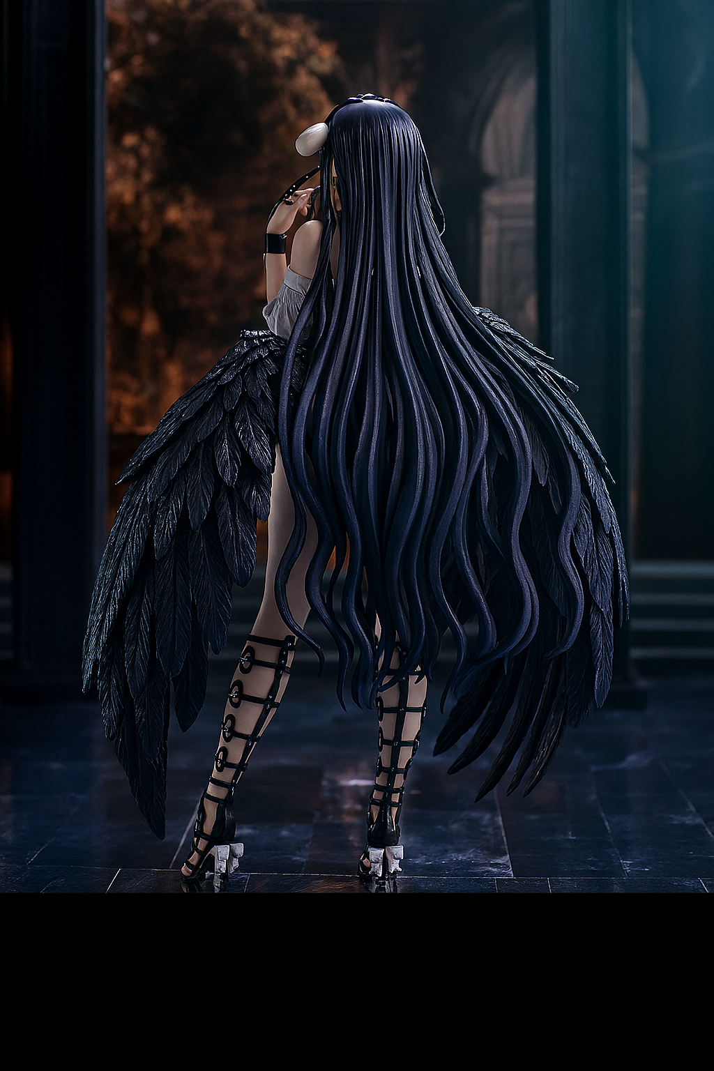 She stands poised in velvet twilight, where silence wraps the marble halls and the echo of loyalty lingers. Shalltear Bloodfallen—guardian, temptress, warrior. Her obsidian wings arc behind her like a forgotten cathedral’s windowpanes, each feather sculpted from stillness and purpose.